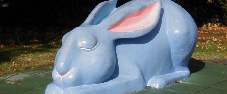 The lesson of slow and steady wins the race is represented by the larger-than-life slow poke of a tortoise and his lightning-quick pal, the blue hare.