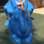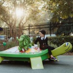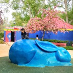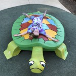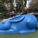 The lesson of slow and steady wins the race is represented by the larger-than-life slow poke of a tortoise and his lightning-quick pal, the blue hare.