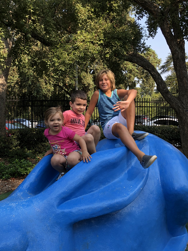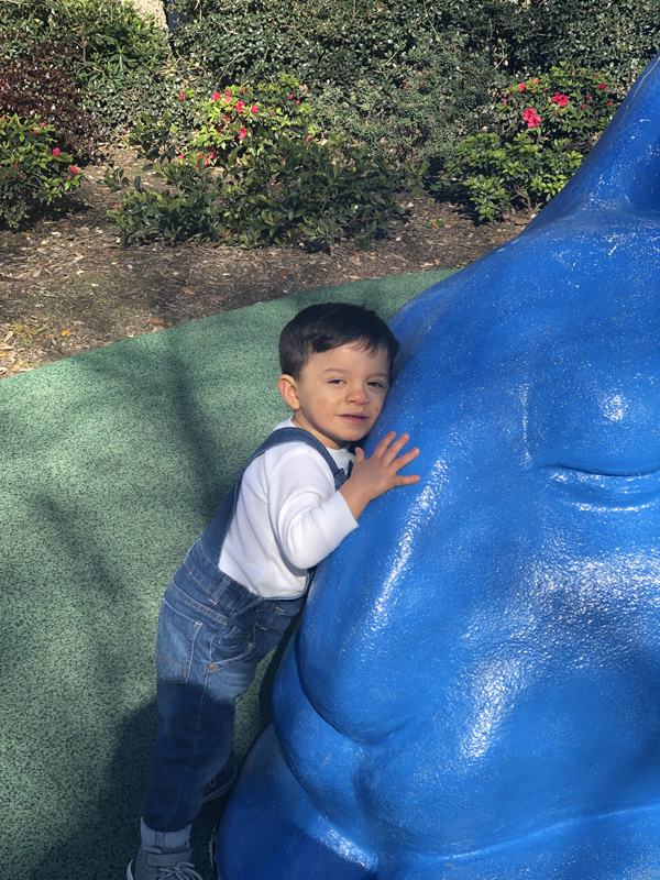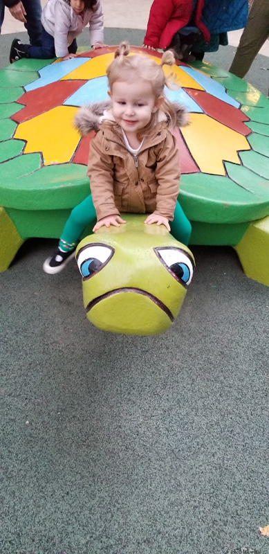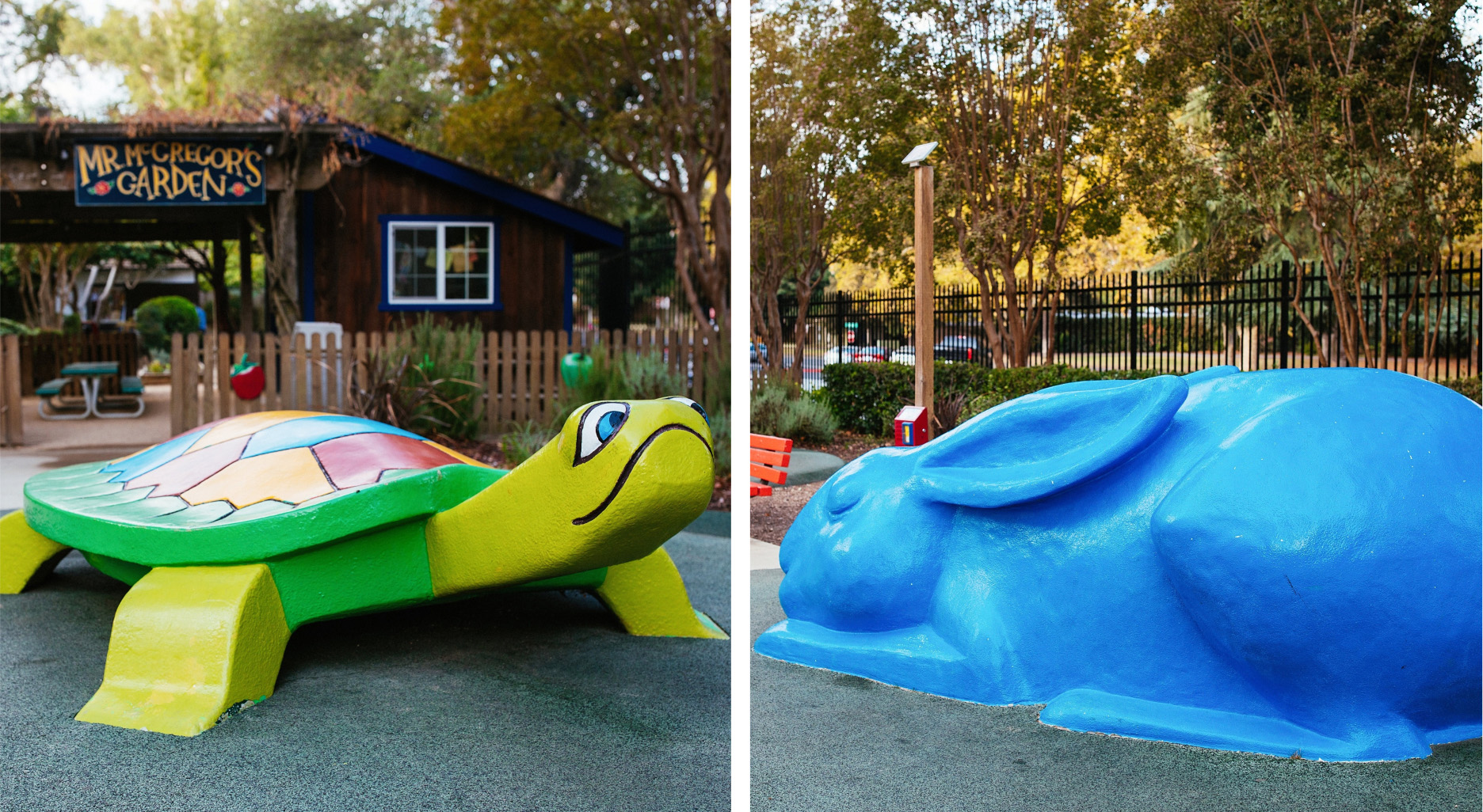 The lesson of slow and steady wins the race is represented by the larger-than-life slow poke of a tortoise and his lightning-quick pal, the blue hare.